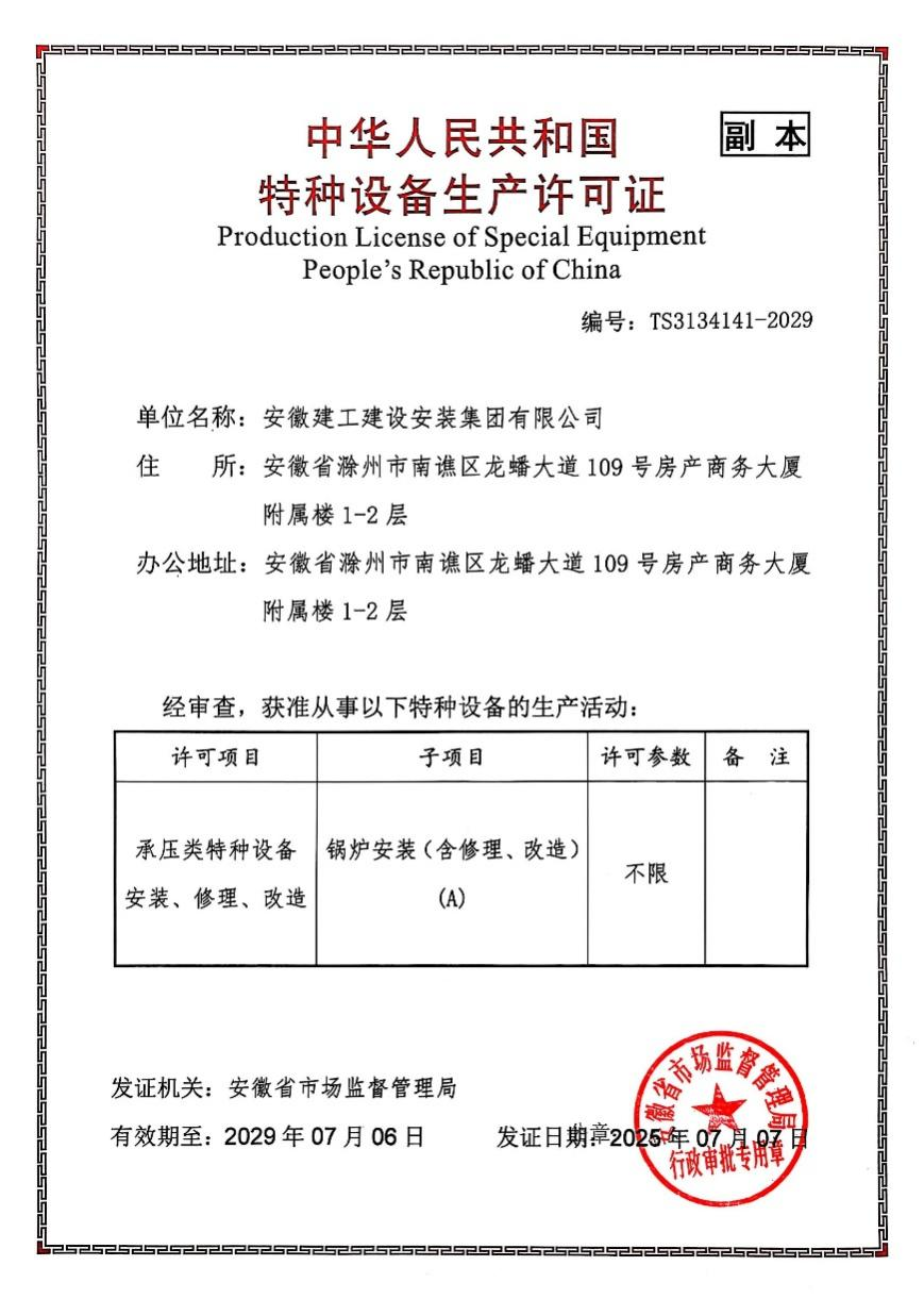 近日,建工安裝“承壓類特種設(shè)備安裝、修理、改造—鍋爐安裝(含修理、改造)(A)”新證申報(bào)工作順利通過安徽省特種設(shè)備檢測(cè)院等各方的評(píng)審核查,現(xiàn)已取得安徽省市場監(jiān)督管理局頒發(fā)的新證。