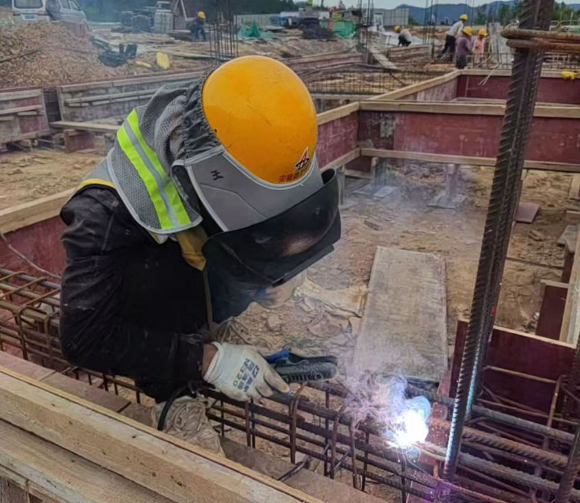 工人穿著汗透的工作服冒著酷暑進(jìn)行基礎(chǔ)防雷接地焊接