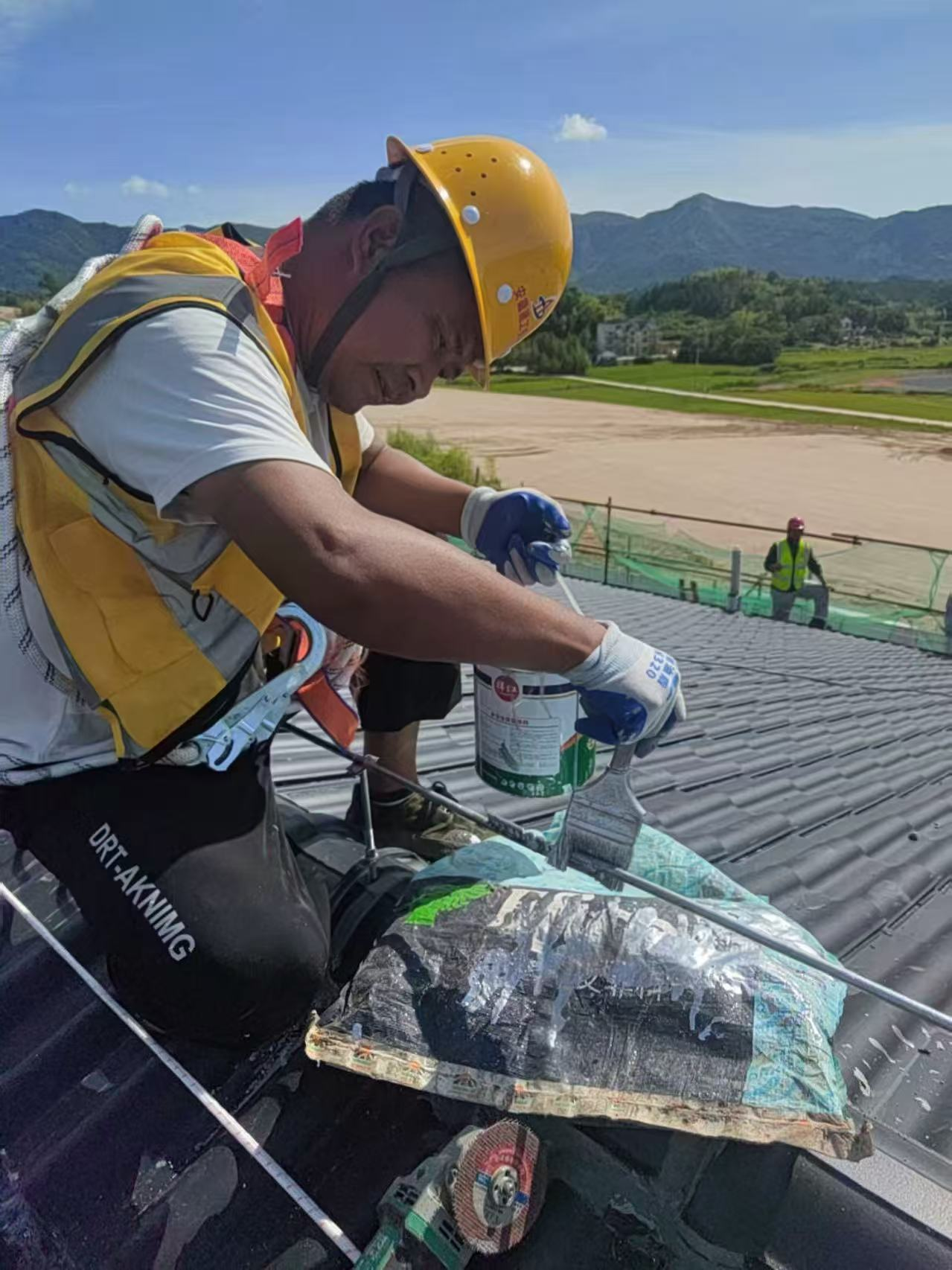工人頂著烈日的灼燒進(jìn)行防銹漆的涂刷