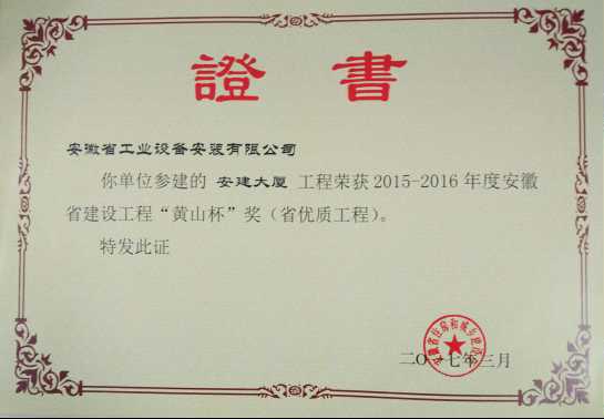日前,2015-2016年度安徽省建設(shè)工程“黃山杯”(省優(yōu)質(zhì)工程)獲獎(jiǎng)工程項(xiàng)目名單公布,公司參建的“安建大廈”通過形式審查、現(xiàn)場復(fù)查、評審委員會(huì)評審等程序,同獲該項(xiàng)殊榮。至此,公司榮獲“黃山杯”達(dá)11尊。同時(shí)“濱湖中心1-3#樓空調(diào)系統(tǒng)工程 ”還榮獲2017年度中國安裝工程優(yōu)質(zhì)獎(jiǎng)(中國安裝之星)。