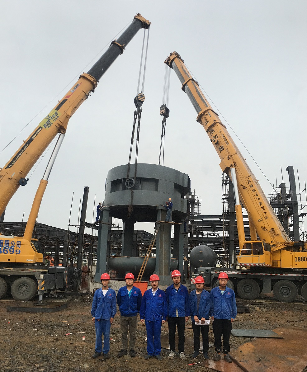 本次吊裝的反應(yīng)器中段部分重達220噸,分公司領(lǐng)導(dǎo)高度重視,吊裝前期,邀請公司總工吳繼成、總工辦主任牛守義和安全部王岳濤經(jīng)理親臨項目部參與設(shè)備吊裝的專題方案討論定稿工作。當日上午,吊裝現(xiàn)場準備工作緊張卻又有條不紊的進行,項目經(jīng)理李子鳳向全體“參戰(zhàn)”員工進行了安全交底,工作人員對兩臺分別為500T、350T吊車的站位及性能再次確認,現(xiàn)場機具、人員均按既定方案實施。分公司經(jīng)理史崇松、業(yè)主單位負責人、監(jiān)理全程在現(xiàn)場“督戰(zhàn)”,全體工作人員經(jīng)過四個小時的奮戰(zhàn),吊裝作業(yè)圓滿結(jié)束。