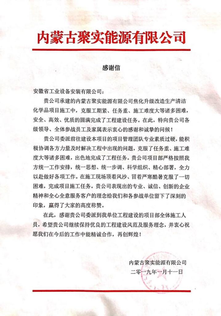 2019年1月14日,安徽安裝承建的內(nèi)蒙古聚實能源有限公司焦化升級改造生產(chǎn)清潔化學品項目,克服工期緊、任務(wù)重、施工難度大等諸多困難,安全、高效、優(yōu)質(zhì)的圓滿完成了工程建設(shè)任務(wù)。業(yè)主內(nèi)蒙古聚實能源公司總經(jīng)理張春軍向公司贈送內(nèi)容為“力克萬難 保中交節(jié)點;眾志成城 創(chuàng)優(yōu)質(zhì)履約”的錦旗。