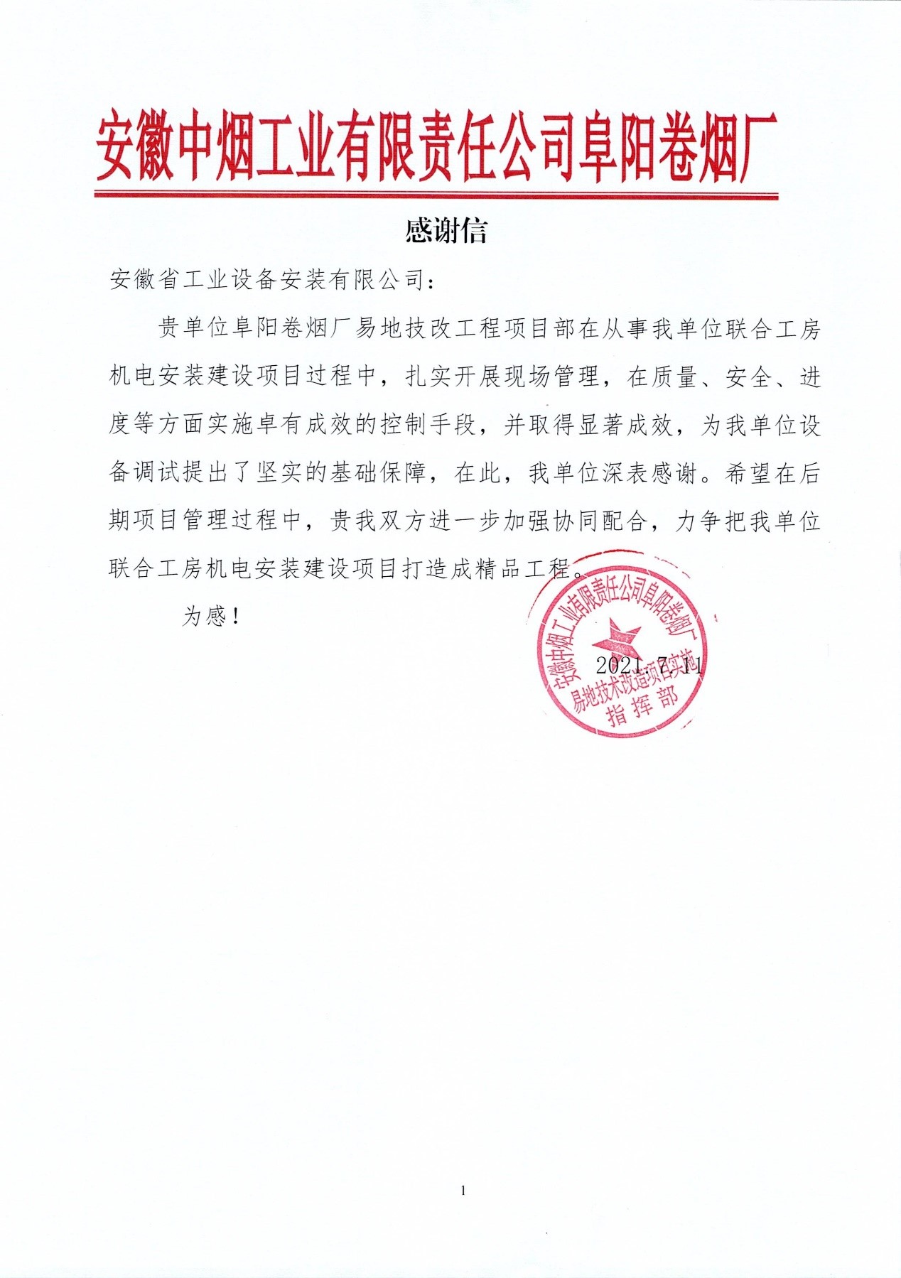 7月11日下午,安徽安裝蚌埠分公司收到安徽中煙阜陽卷煙廠發(fā)來的感謝信。信中對安徽安裝蚌埠分公司承建的聯(lián)合工房機電安裝項目表達了充分認可和高度贊譽。