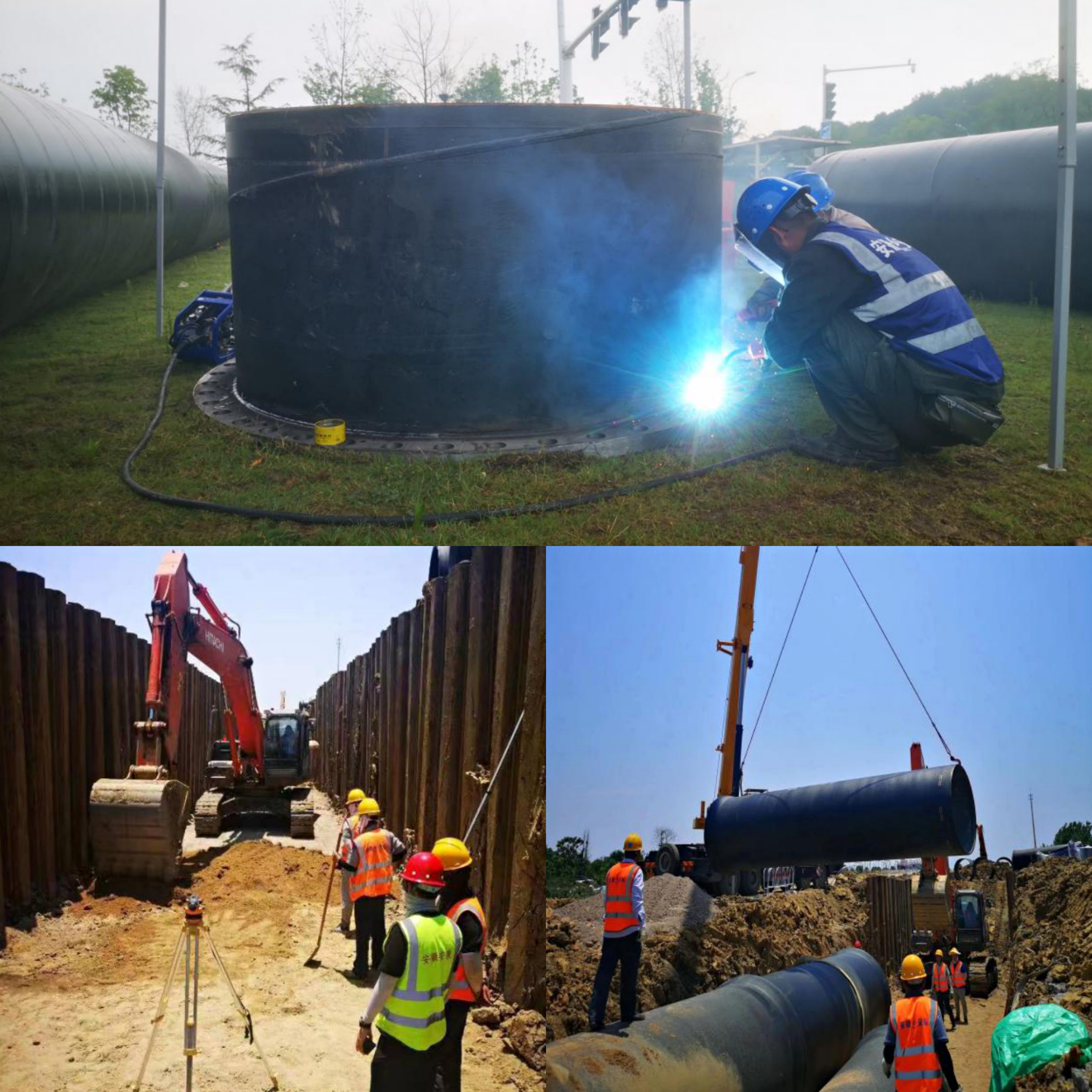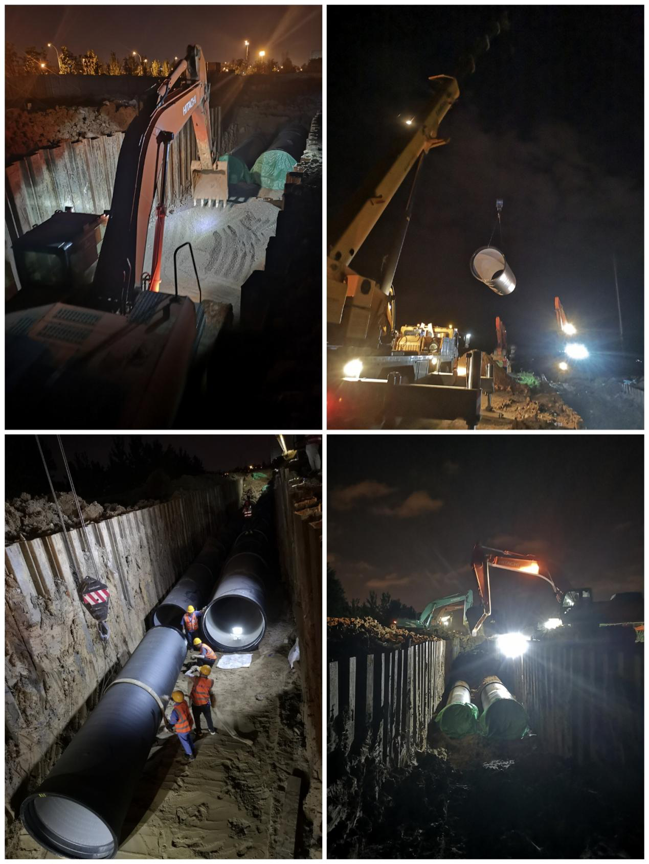 圖為市政分公司四水廠DN1800、DN1400供水管道遷建工程管網(wǎng)項目正在緊張施工。1.焊花綻放、夏季中最美的煙花,2名焊工,正在對DN1800鋼管與法蘭進行焊接(上圖)2. 50噸吊車正在對DN1800球墨鑄鐵管進行吊裝(右下圖);3. 槽底換填、鋪砂墊層(左下圖)