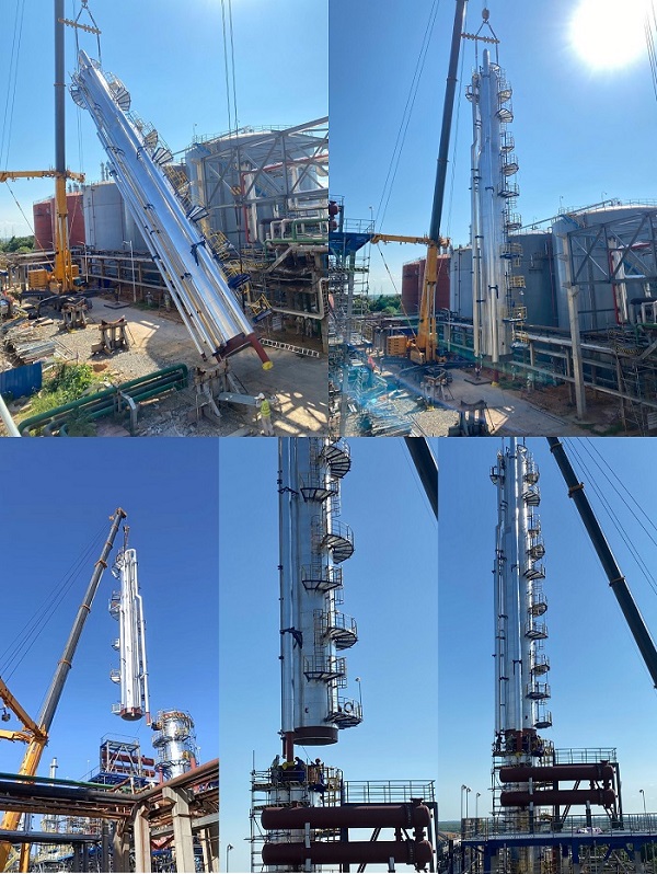 陣陣轟鳴聲中,汽提塔上段在兩臺500噸、160噸吊車的默契配合下緩緩升高,直至完全吊離鞍座。15時48分,汽提塔上段豎立,溜索摘除,由主吊車穩(wěn)步吊向汽提塔下段上方,對準接口慢慢落下,工人師傅立即上前組對點口,16時12分點口完成。為爭取寶貴時間,項目部實行管理人員輪班制、班組夜間倒班制,通宵焊接作業(yè),于次日中午時分完成組對焊接。為保證組對質量,剛焊接完的汽提塔上段還要被吊車“提拎著”靜置12小時以上。最終在8月7日7時48分,隨著主吊車緩緩摘鉤,安慶石化200噸/時污水汽提裝置項目重要節(jié)點——汽提塔上段空中組對完美收官,整個過程歷經40個小時。