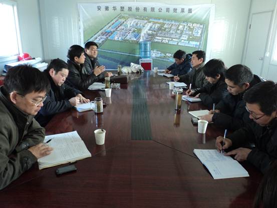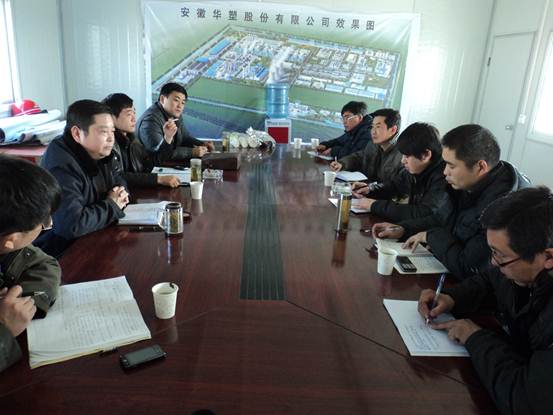 王總一行首先聽取了安徽華塑項目部關于質量、安全文明、施工進度、工作目標和下一步工作計劃的匯報。王總一行對安徽華塑項目部在開工短短兩個月內取得的成績給予充分肯定。王總特別指出,在工期緊、任務重、困難大的情況下,項目部一定要思想上重視,制定科學合理的方案,與施工各方進行高效溝通,搶工期、保質量、展風采,為后續(xù)工程的承接創(chuàng)造有利條件。